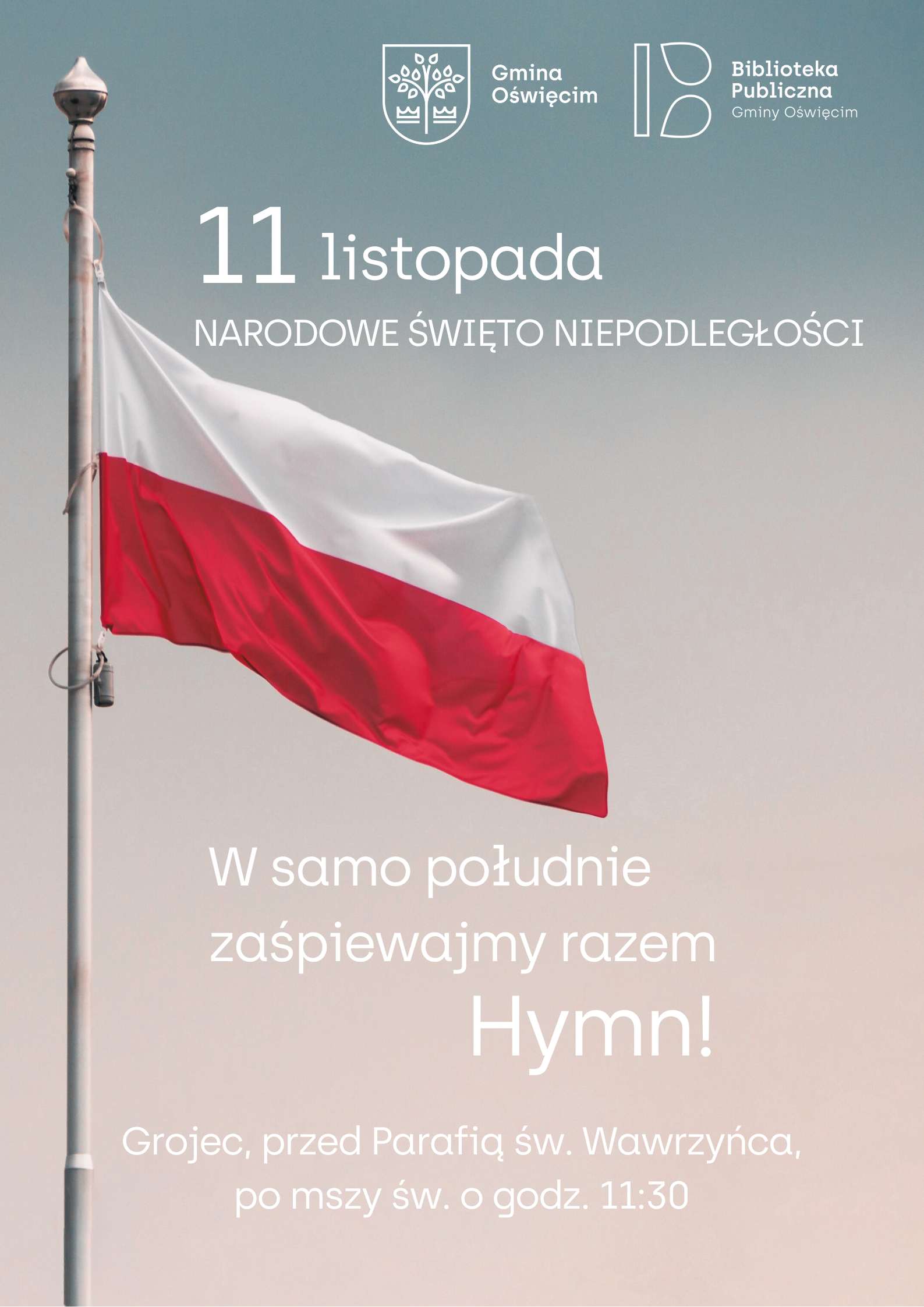 Biblioteka Publiczna Gminy Oświęcim serdecznie zaprasza na wspólne śpiewanie Hymnu państwowego Rzeczypospolitej Polskiej, które odbędzie się 11 listopada w Grojcu, pod Parafią św. Wawrzyńca, po Mszy Świętej o godzinie 11:30.