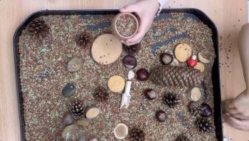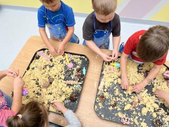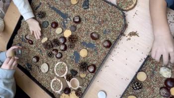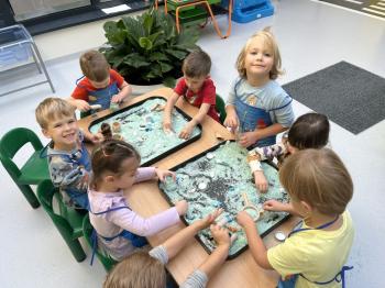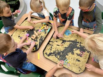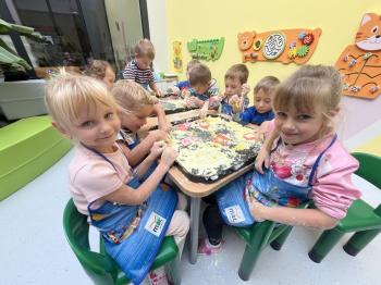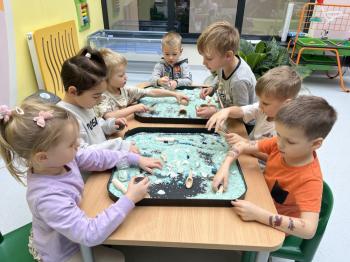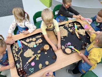 Dzieci odkrywały też „skarby ukryte w piasku”, rozwijając spostrzegawczość i cierpliwość. Nie zabrakło kreatywności – przedszkolaki same stworzyły ciastolinowe jeże oraz różnorodne jesienne pejzaże, wykazując się pomysłowością i zręcznością.