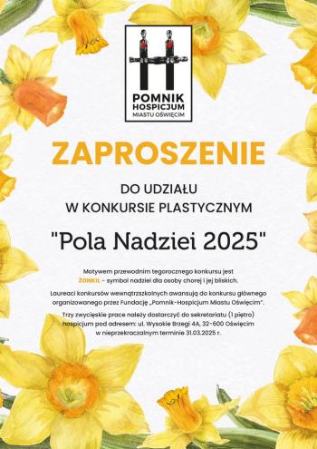 Zaprazamy do udziału w konkursie plastycznym "Pola nadziei" organizowanym przez Fundację "Pomnik-Hospicjum Miastu Oświęcim". Szczegóły konkursu znajdują się w załącznikach. Na zwycięzców czekają nagrody.