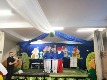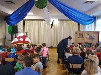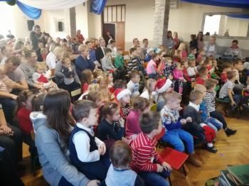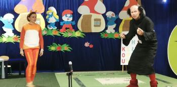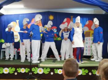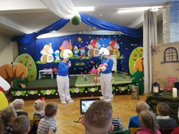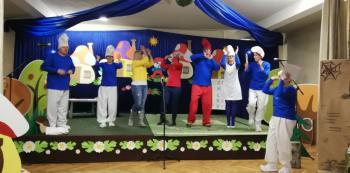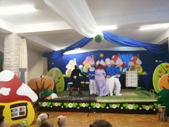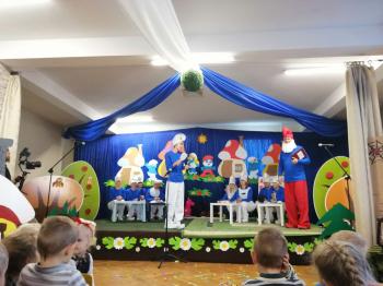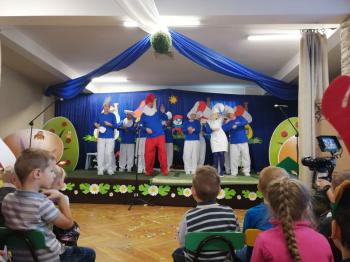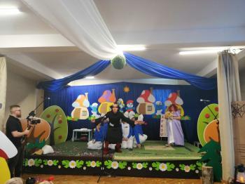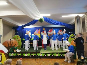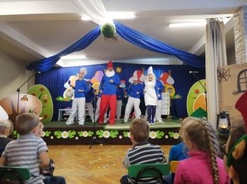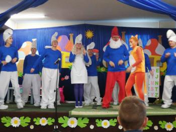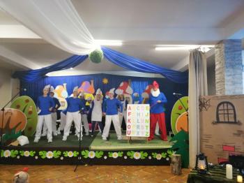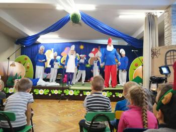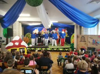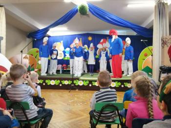 W tym roku tradycyjnie rodzice i personel naszego przedszkola przygotował bajkę dla dzieci z okazji spotkania z Mikołajem. Był to już czwarty występ, a tym razem dzieci i rodzice mogli obejrzeć przedstawienie pt. ,,Smerfy.” Kiedy na scenie pojawiły się niebieskie ludki oraz Hogata i Gargamel ze swymi kotem Klakierem, rozległy się brawa, a buzie dzieci rozpromieniły się uśmiechem, choć nie brakowało najmłodszych widzów, dla których widok Gargamela był zbyt emocjonalny. Tym razem rodzice oraz pani dyrektor pod czujnym okiem reżysera Barbary Szubert, podczas wielu prób szlifowali swój talent aktorski wzbogacony dodatkowo o taniec i śpiew, którego w tym spektaklu nie brakowało.